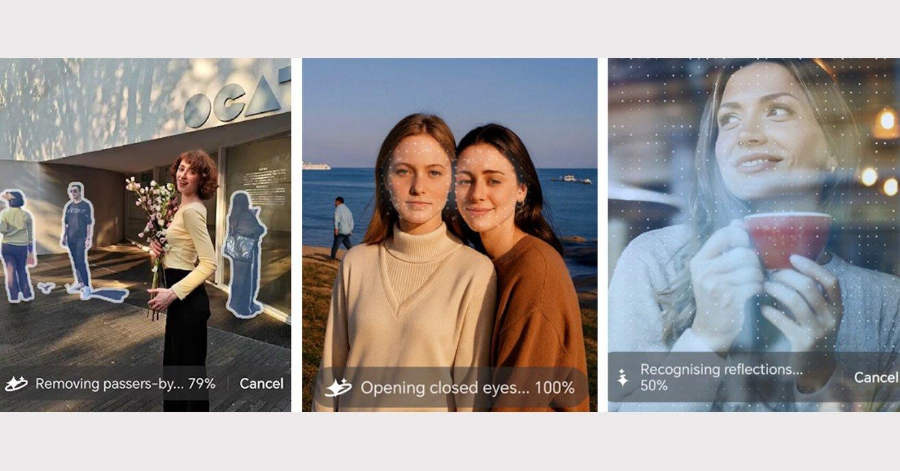 تحرير صور شامل بالـ AI تخلّص من الانعكاسات لتبدو صورك كما تراها بعينيك وحوّل العيون المغلقة إلى ابتسامات لتحافظ على روعة صورك الجماعية وبلمسة واحدة للتخلص من الأشخاص المارين احتفظ فقط باللحظات المهمة.