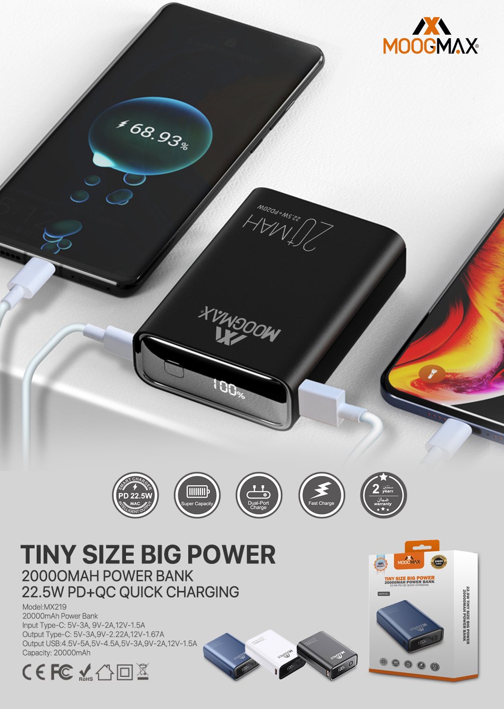 شاحن متنقل ميني بقوة 20000 الف مللي امبير مزود بشاشة رقمية و منفذي بيدي و يو اس بي موج ماكس قامت شركة موج ماكس بإنتاج باور بانك صغير جدا في حجمه بمميزات وقوة شحن عالية جداً ورهيبة يشحن لك أجهزتك بسرعة بدون حمل بطارية شحن كبيرة وذات وزن ثقيل بالإضافة إلى ذلك فإن هذه البطارية المتنقلة تعمل على شحن أجهزتك في فترة زمنية قصيرة جداً دون الحاجة للانتظار لفترات طويلة