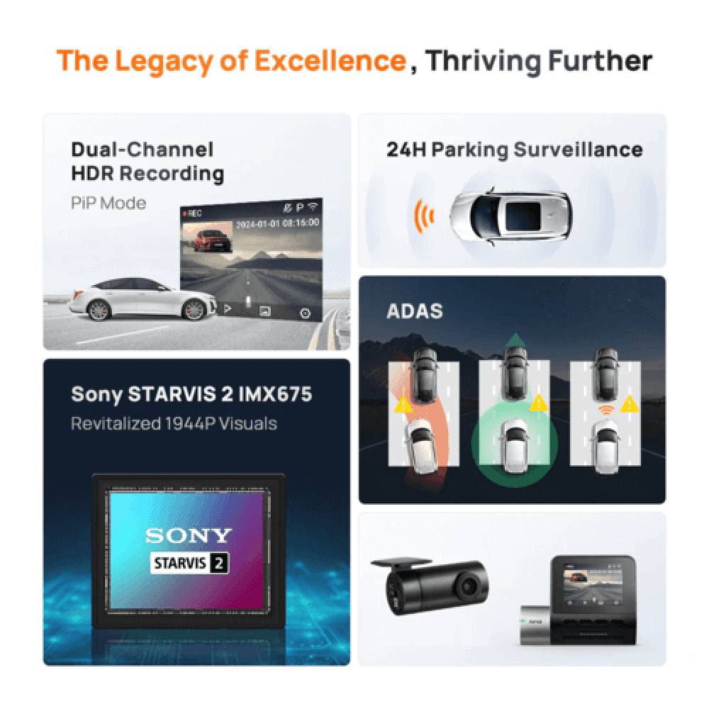 يأتي كاميرا السيارة 70mai Dash Cam A510 مزودة بمستشعر Sony STARVIS 2 IMX675 المتطور، مما يوفر قدرات رؤية ليلية ممتازة ونطاق ديناميكي عالي (HDR). تمكّن تقنية HDR ثنائية القناة من رفع جودة الصور إلى مستوى جديد بدقة 1944 بكسل.