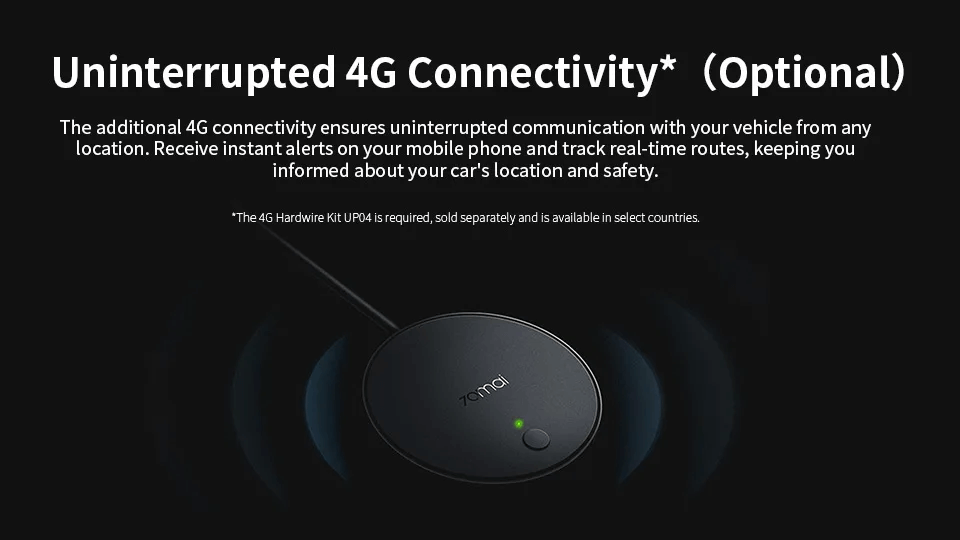 يضمن الاتصال الإضافي 4G الاتصال دون انقطاع مع سيارتك من أي مكان. احصل على تنبيهات فورية على هاتفك المحمول وتتبع المسارات في الوقت الفعلي ، مما يبقيك على علم بموقع سيارتك.