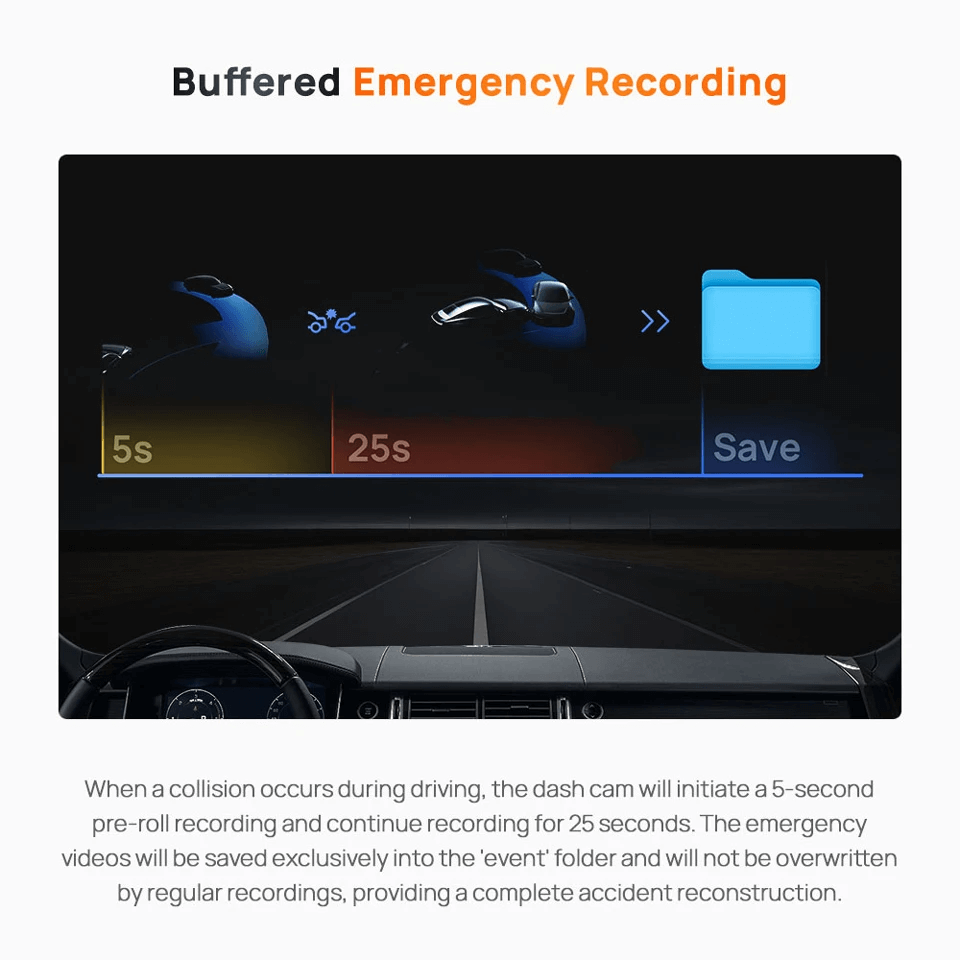 عند حدوث تصادم أثناء القيادة ، ستقوم الداش كام ببدء تسجيل لمدة 5 ثوانٍ ومواصلة التسجيل لمدة 25 ثانية. سيتم حفظ مقاطع فيديو الطوارئ حصريًا في مجلد "الحدث" ولن تتم محوها والتسجيل عليها.